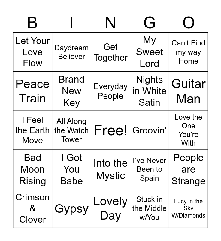 This bingo card has a free space and 33 words: 50 Ways to Leave Your Lover, 7 Bridges Road, All Along the Watch Tower, Baby I’m-A Want You, Bad Moon Rising, Brand New Key, Can’t Find my way Home, Crimson & Clover, Daydream Believer, Do You Believe in Magic, Everyday People, Get Together, Going to California, Good Vibrations, Groovin’, Guitar Man, Gypsy, I Feel the Earth Move, I Got You Babe, I’ve Never Been to Spain, Into the Mystic, Joy to the World, Let Your Love Flow, Love the One You’re With, Lovely Day, Lucy in the Sky W/Diamonds, My Sweet Lord, Nights in White Satin, Peace Train, People are Strange, Shambala, Stuck in the Middle w/You and White Rabbit.