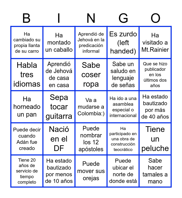 This bingo card has a free space and 29 words: Tiene 20 años de servicio de tiempo completo, Tiene puesto una camisa azul, Sepa tocar guitarra, Sabe bailar salsa, Ha cambiado su propia llanta de su carro, Aprendió de Jehová en la predicación informal, Aprendió de Jehová de casa en casa, Nació en el DF, Ha ido a una asamblea especial o internacional, Ha estado bautizado por menos de 10 años, Ha estado bautizado por más de 40 años, Sabe hacer tamales a mano, Puede mover sus orejas, Puede ubicar el norte de donde está, Que se hizo publicador en los últimos dos años, Está en la escuela primaria, Puede nombrar los 12 apóstoles, Puede decir cuando Adán fue creado, Ha visitado a Mt.Rainier, Ha horneado un pan, Ha participado en una obra de construcción teocrático, Toma café todos los días, Sabe un saludo en lenguaje de señas, Habla tres idiomas, Es zurdo (left handed), Ha montado un caballo, Tiene un peluche, Sabe coser ropa and Ha visitado a Betel.