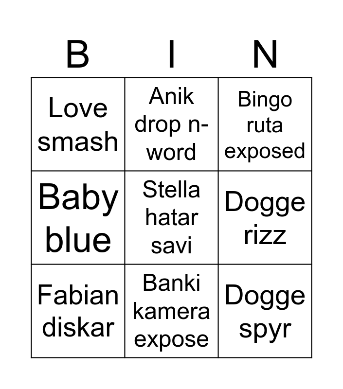 This bingo card has a free space and 8 words: Dogge rizz, Bingo ruta exposed, Anik drop n-word, Fabian diskar, Love smash, Dogge spyr, Baby blue and Banki kamera expose.