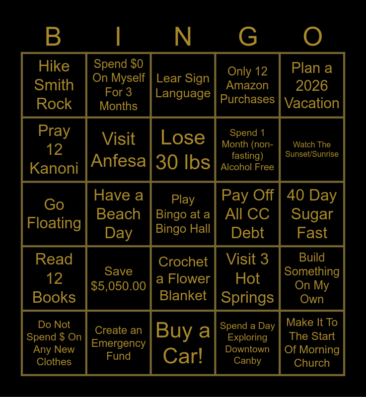 This bingo card has 25 words: Save $5,050.00, Buy a Car!, Lose 30 lbs, Do Not Spend $ On Any New Clothes, Plan a 2026 Vacation, Hike Smith Rock, Pray 12 Kanoni, Spend $0 On Myself For 3 Months, Pay Off All CC Debt, Crochet a Flower Blanket, Spend 1 Month (non-fasting) Alcohol Free, Go Floating, Visit 3 Hot Springs, Build Something On My Own, Visit Anfesa, Make It To The Start Of Morning Church, 40 Day Sugar Fast, Lear Sign Language, Watch The Sunset/Sunrise, Have a Beach Day, Play Bingo at a Bingo Hall, Create an Emergency Fund, Read 12 Books, Only 12 Amazon Purchases and Spend a Day Exploring Downtown Canby.