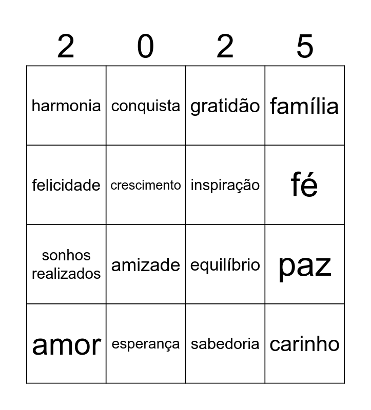 This bingo card has 20 words: paz, saúde, gratidão, sucesso, amor, felicidade, esperança, harmonia, sonhos realizados, conquista, amizade, equilíbrio, crescimento, carinho, inspiração, empatia, fé, família, sabedoria and criatividade.