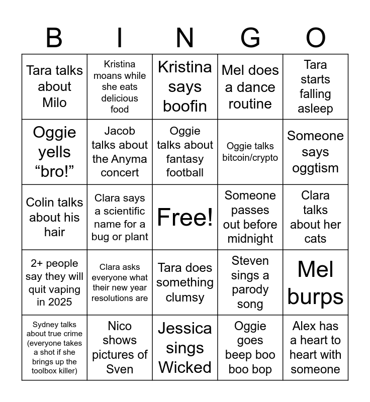 This bingo card has a free space and 28 words: Mel burps, Kristina with her signature “OOOoooOoo”, Oggie talks bitcoin/crypto, Oggie goes beep boo boo bop, Oggie yells “bro!”, Kristina says boofin, Kristina moans while she eats delicious food, 2+ people say they will quit vaping in 2025, Someone passes out before midnight, Sydney talks about true crime (everyone takes a shot if she brings up the toolbox killer), Colin talks about his hair, Mel does a dance routine, Nico shows pictures of Sven, Jessica sings Wicked, Someone says oggtism, Jessica does interpretive dancing, Clara asks everyone what their new year resolutions are, Jacob talks about the Anyma concert, Oggie talks about fantasy football, Tara does something clumsy, Tara talks about Milo, Jacob suggests going to Mammoth, Vegas, Laughlin, or Havasu, Alex has a heart to heart with someone, Clara says a scientific name for a bug or plant, Clara talks about her cats, Steven sings a parody song, Tara starts falling asleep and Steven or Mel references Monty Python.