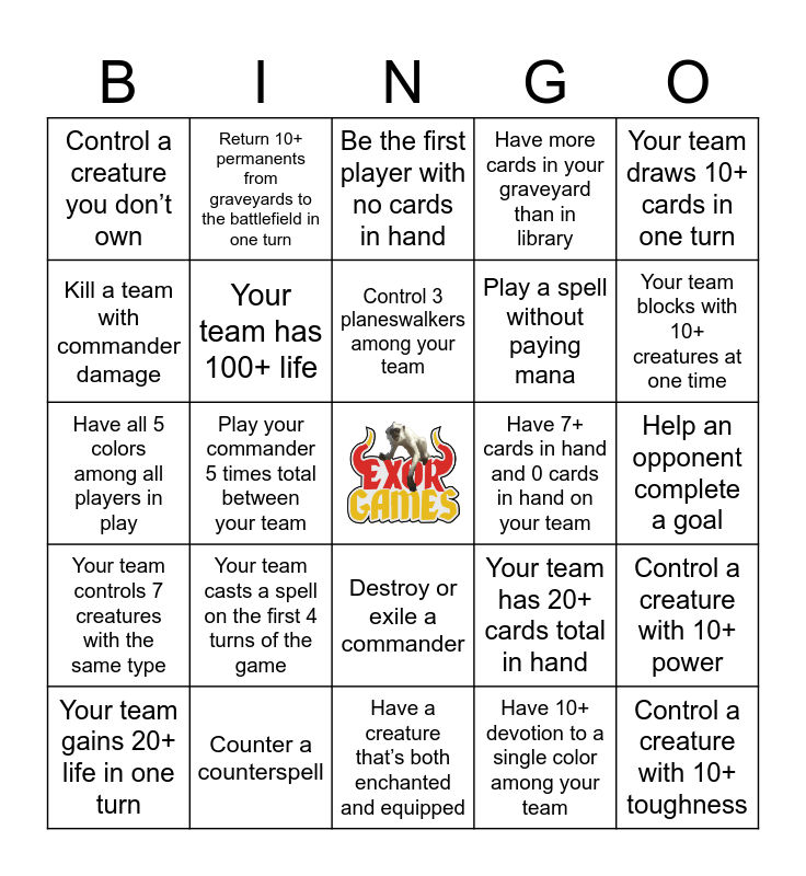 This bingo card has a free space and 32 words: Have 10+ devotion to a single color among your team, Cast turn 1 Sol Ring, Play your commander 5 times total between your team, Ultimate a planeswalker, Your team controls 7 creatures with the same type, Your team has 100+ life, Your team draws 10+ cards in one turn, Control a creature with 10+ power, Return 10+ permanents from graveyards to the battlefield in one turn, Draw first blood, Control 3 planeswalkers among your team, Be the first player with no cards in hand, Your team has 15+ lands total in play, Your team casts 7+ spells in one turn, Have 7+ cards in hand and 0 cards in hand on your team, Destroy 15+ creatures at one time, Your team gains 20+ life in one turn, Have all 5 colors among all players in play, Destroy or exile a commander, Your team casts a spell on the first 4 turns of the game, Your team has 20+ cards total in hand, Destroy a mana rock on or before turn 4, Help an opponent complete a goal, Counter a counterspell, Control a creature with 10+ toughness, Have more cards in your graveyard than in library, Play a spell without paying mana, Kill a team with commander damage, Control a creature you don’t own, Have a creature that’s both enchanted and equipped, Your team attacks with 10+ creatures at one time and Your team blocks with 10+ creatures at one time.