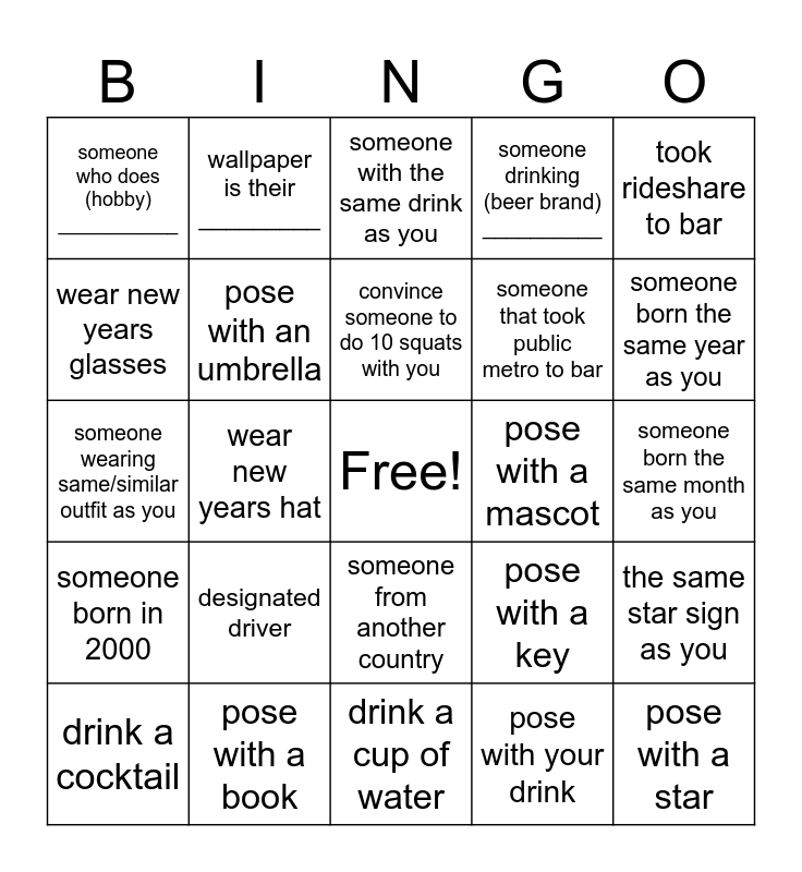 This bingo card has a free space and 28 words: the same star sign as you, last movie they saw __________, someone that took public metro to bar, pose with your drink, wear new years glasses, someone with the same drink as you, wallpaper is their _________, someone born in 2000, pose with a mascot, drink a cocktail, someone wearing same/similar outfit as you, someone drinking (beer brand) __________, pose with a book, drink a cup of water, someone born the same year as you, someone wearing a _________ graphic tee, designated driver, pose with an umbrella, convince someone to do 10 squats with you, someone from another country, someone who does (hobby) ___________, someone born in the 90s, pose with a star, wear new years hat, someone born the same month as you, pose with a key, took rideshare to bar and someone from (state) _________.