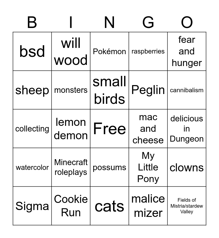 This bingo card has a free space and 24 words: Minecraft roleplays, Cookie Run, small birds, Sigma, fear and hunger, bsd, sheep, will wood, mac and cheese, possums, Peglin, collecting, My Little Pony, clowns, monsters, malice mizer, delicious in Dungeon, Pokémon, cannibalism, lemon demon, Fields of Mistria/stardew Valley, watercolor, raspberries and cats.