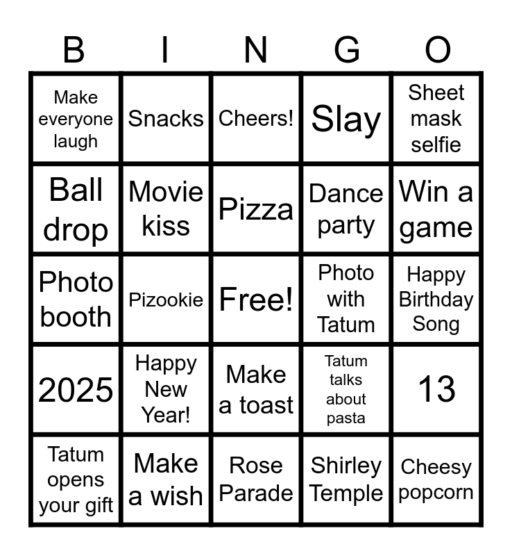This bingo card has a free space and 24 words: Happy New Year!, Make a wish, Pizza, Tatum opens your gift, Sheet mask selfie, Make everyone laugh, Ball drop, Snacks, Photo with Tatum, Make a toast, Dance party, Photo booth, Tatum talks about pasta, 13, Movie kiss, Shirley Temple, Happy Birthday Song, Cheers!, Win a game, Pizookie, Cheesy popcorn, 2025, Slay and Rose Parade.