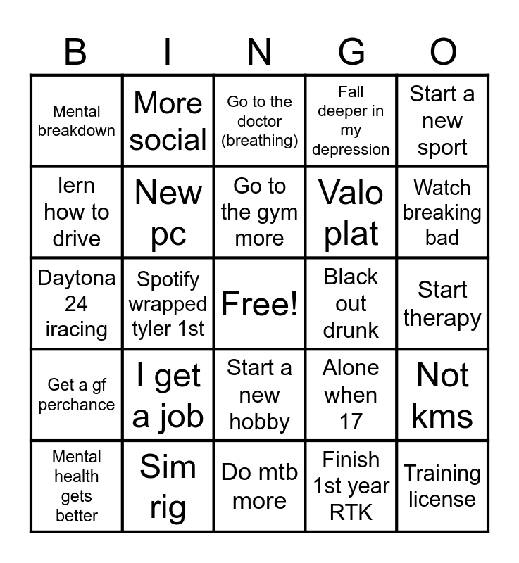 This bingo card has a free space and 24 words: I get a job, Sim rig, Go to the gym more, Mental health gets better, Start a new sport, Mental breakdown, lern how to drive, More social, Black out drunk, Start a new hobby, Valo plat, Daytona 24 iracing, Alone when 17, Not kms, New pc, Finish 1st year RTK, Start therapy, Go to the doctor (breathing), Watch breaking bad, Spotify wrapped tyler 1st, Training license, Get a gf perchance, Fall deeper in my depression and Do mtb more.