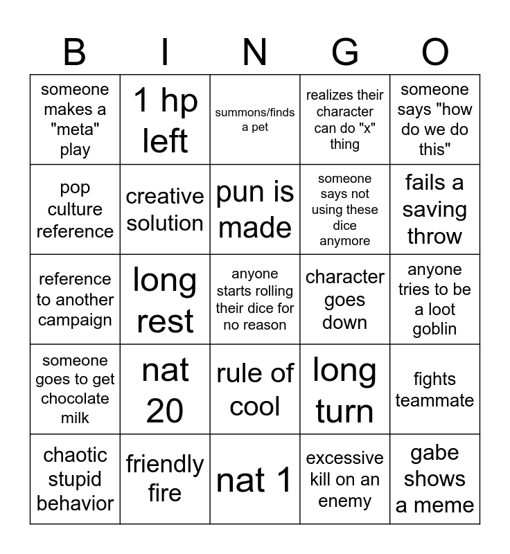 This bingo card has 25 words: nat 20, nat 1, pun is made, chaotic stupid behavior, someone says "how do we do this", someone makes a "meta" play, pop culture reference, 1 hp left, character goes down, rule of cool, someone says not using these dice anymore, reference to another campaign, long turn, fights teammate, creative solution, gabe shows a meme, anyone tries to be a loot goblin, summons/finds a pet, fails a saving throw, long rest, anyone starts rolling their dice for no reason, friendly fire, someone goes to get chocolate milk, realizes their character can do "x" thing and excessive kill on an enemy.