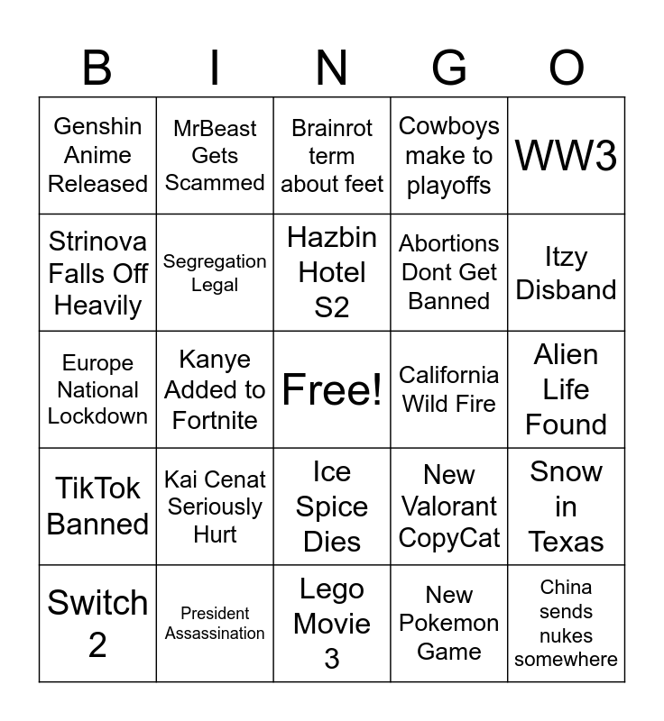 This bingo card has a free space and 24 words: Kai Cenat Seriously Hurt, President Assassination, Hazbin Hotel S2, Switch 2, WW3, Genshin Anime Released, Strinova Falls Off Heavily, MrBeast Gets Scammed, California Wild Fire, Ice Spice Dies, Abortions Dont Get Banned, Europe National Lockdown, New Valorant CopyCat, Snow in Texas, Segregation Legal, New Pokemon Game, Alien Life Found, Brainrot term about feet, Itzy Disband, Kanye Added to Fortnite, China sends nukes somewhere, TikTok Banned, Cowboys make to playoffs and Lego Movie 3.