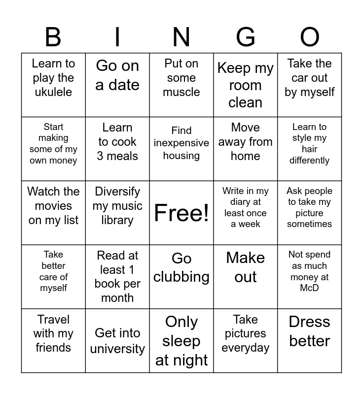 This bingo card has a free space and 24 words: Read at least 1 book per month, Get into university, Find inexpensive housing, Travel with my friends, Take the car out by myself, Learn to play the ukulele, Start making some of my own money, Go on a date, Write in my diary at least once a week, Go clubbing, Move away from home, Watch the movies on my list, Make out, Not spend as much money at McD, Learn to cook 3 meals, Take pictures everyday, Ask people to take my picture sometimes, Put on some muscle, Learn to style my hair differently, Diversify my music library, Dress better, Take better care of myself, Keep my room clean and Only sleep at night.