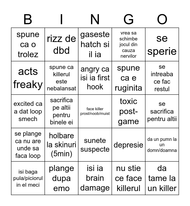 This bingo card has a free space and 24 words: holbare la skinuri (5min), plange dupa emo, angry ca isi ia first hook, isi baga pula/piciorul in el meci, se sperie, spune ca o trolez, acts freaky, rizz de dbd, toxic post-game, sunete suspecte, spune ca e ruginita, excited ca a dat loop smech, depresie, da un pumn la un domn/doamna, spune ca killerul este nebalansat, nu stie ce face killerul, se sacrifica pentru altii, gaseste hatch si il ia, se intreaba ce fac restul, sacrifica pe altii pentru binele ei, da tame la un killer, se plange ca nu are unde sa faca loop, vrea sa schimbe jocul din cauza nervilor and isi ia brain damage.