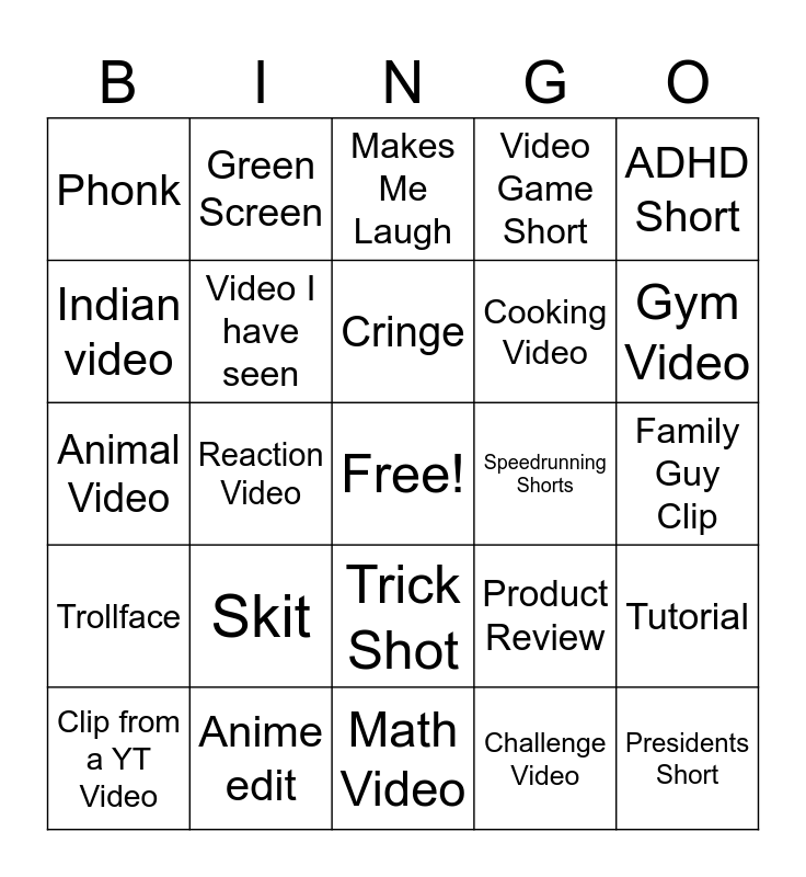 This bingo card has a free space and 24 words: Skit, Anime edit, Cringe, Clip from a YT Video, ADHD Short, Phonk, Indian video, Green Screen, Speedrunning Shorts, Trick Shot, Cooking Video, Animal Video, Product Review, Tutorial, Video I have seen, Challenge Video, Family Guy Clip, Makes Me Laugh, Gym Video, Reaction Video, Presidents Short, Trollface, Video Game Short and Math Video.