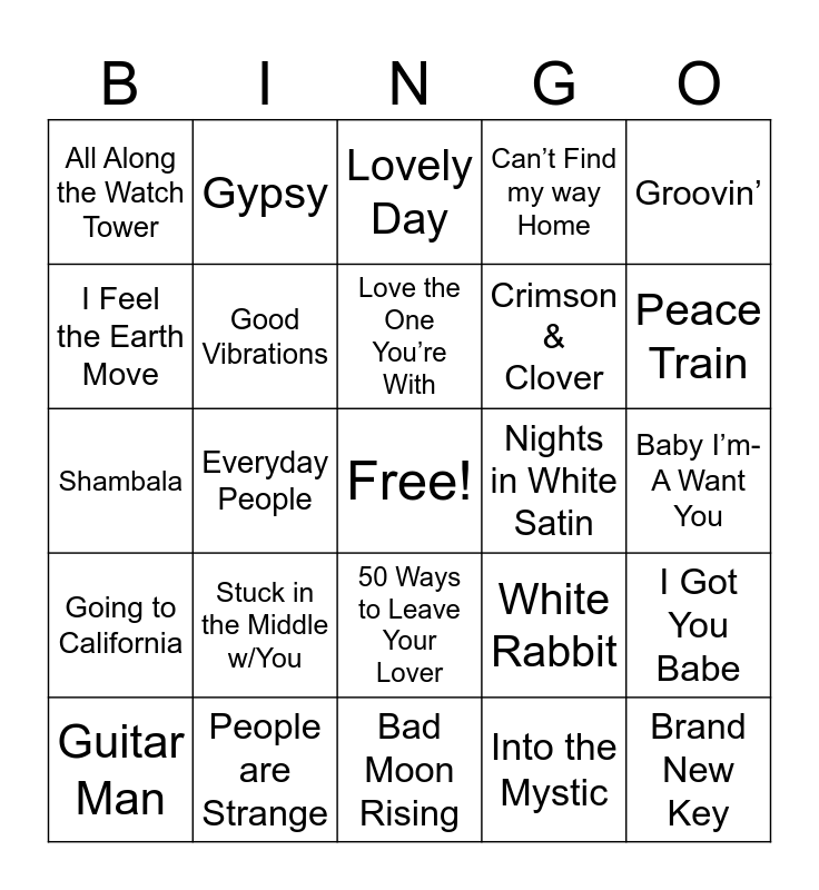 This bingo card has a free space and 33 words: Daydream Believer, Do You Believe in Magic, Everyday People, Get Together, Going to California, Good Vibrations, Groovin’, Guitar Man, Gypsy, Let Your Love Flow, Love the One You’re With, Lovely Day, Lucy in the Sky W/Diamonds, My Sweet Lord, Nights in White Satin, Peace Train, People are Strange, Shambala, Stuck in the Middle w/You, White Rabbit, 50 Ways to Leave Your Lover, 7 Bridges Road, All Along the Watch Tower, Baby I’m-A Want You, Bad Moon Rising, Brand New Key, Can’t Find my way Home, Crimson & Clover, I Feel the Earth Move, I Got You Babe, I’ve Never Been to Spain, Into the Mystic and Joy to the World.