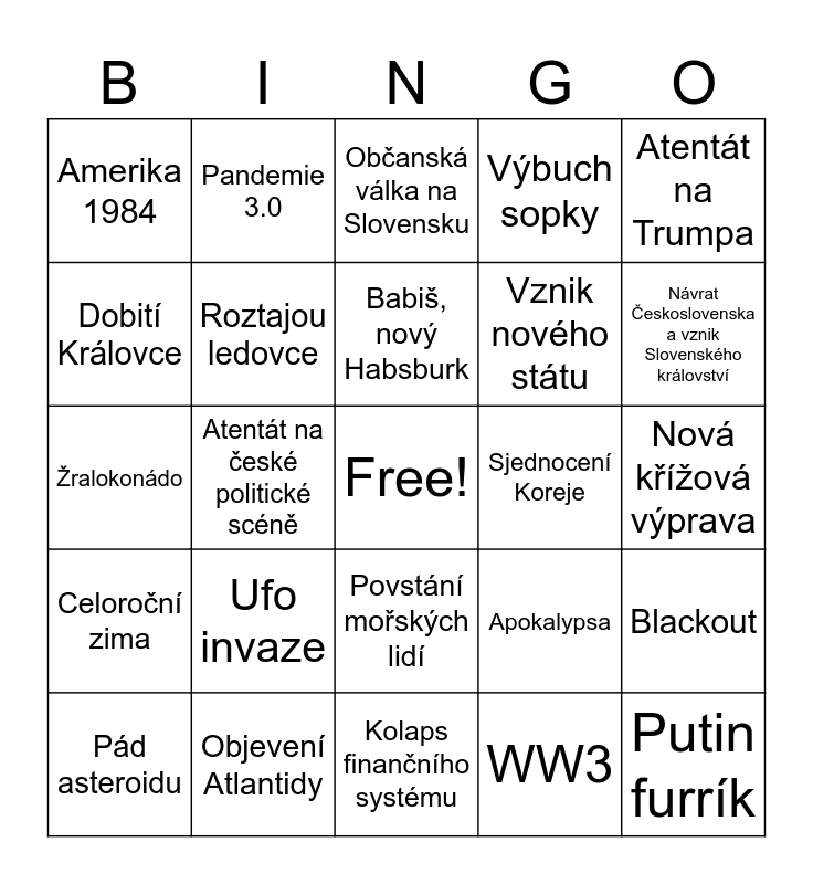 This bingo card has a free space and 24 words: Ufo invaze, Objevení Atlantidy, Babiš, nový Habsburk, Pád asteroidu, Atentát na Trumpa, Amerika 1984, Dobití Královce, Pandemie 3.0, Sjednocení Koreje, Povstání mořských lidí, Vznik nového státu, Žralokonádo, Apokalypsa, Blackout, Roztajou ledovce, WW3, Nová křížová výprava, Občanská válka na Slovensku, Návrat Československa a vznik Slovenského království, Atentát na české politické scéně, Putin furrík, Celoroční zima, Výbuch sopky and Kolaps finančního systému.