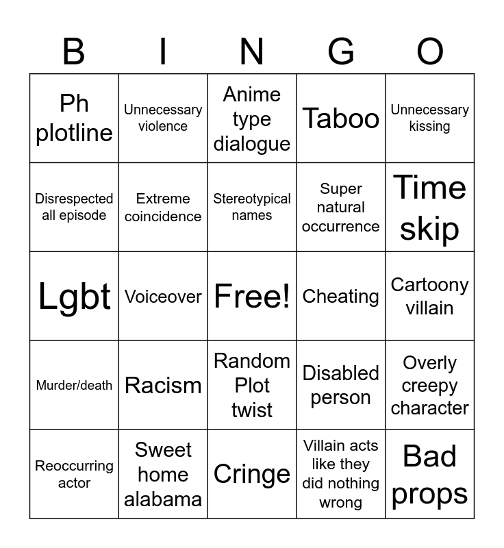 This bingo card has a free space and 24 words: Racism, Sweet home alabama, Stereotypical names, Reoccurring actor, Unnecessary kissing, Ph plotline, Disrespected all episode, Unnecessary violence, Cheating, Random Plot twist, Super natural occurrence, Lgbt, Disabled person, Overly creepy character, Extreme coincidence, Villain acts like they did nothing wrong, Cartoony villain, Anime type dialogue, Time skip, Voiceover, Bad props, Murder/death, Taboo and Cringe.