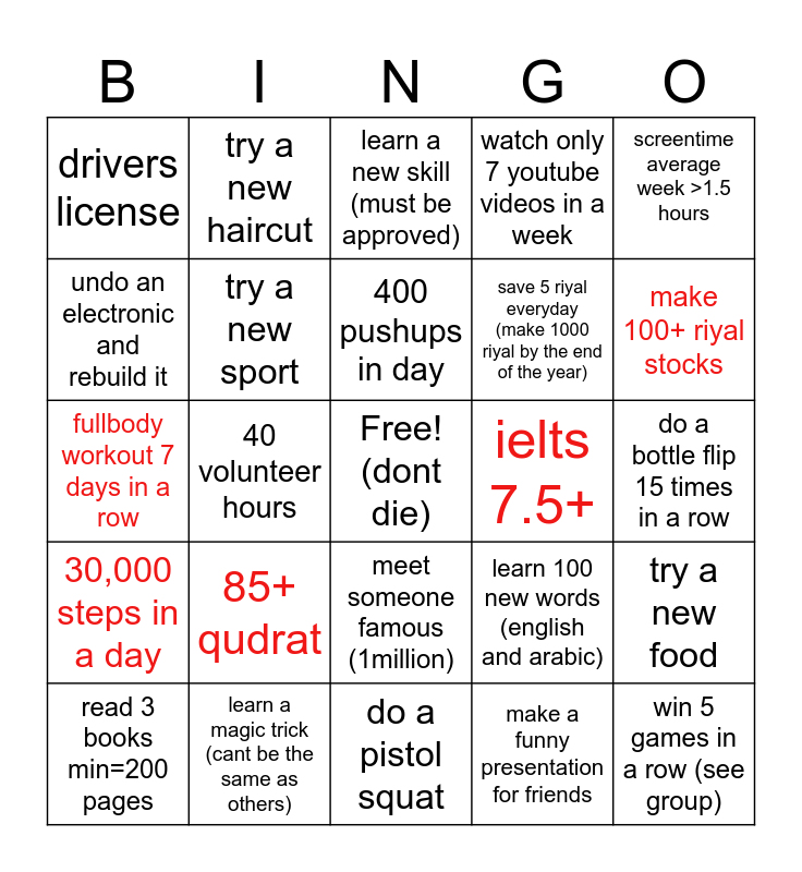This bingo card has a free space and 24 words: 85+ qudrat, learn a magic trick (cant be the same as others), 400 pushups in day, read 3 books min=200 pages, screentime average week >1.5 hours, drivers license, undo an electronic and rebuild it, try a new haircut, ielts 7.5+, meet someone famous (1million), save 5 riyal everyday (make 1000 riyal by the end of the year), fullbody workout 7 days in a row, learn 100 new words (english and arabic), try a new food, try a new sport, make a funny presentation for friends, do a bottle flip 15 times in a row, learn a new skill (must be approved), make 100+ riyal stocks, 40 volunteer hours, win 5 games in a row (see group), 30,000 steps in a day, watch only 7 youtube videos in a week and do a pistol squat.