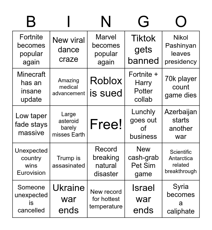 This bingo card has a free space and 29 words: Someone unexpected is cancelled, The One Piece is revealed, Large asteroid barely misses Earth, New Muppets movie, Fortnite becomes popular again, Marvel becomes popular again, Amazing medical advancement, Trump is assasinated, Lunchly goes out of business, Ukraine war ends, Azerbaijan starts another war, Syria becomes a caliphate, New record for hottest temperature, Israel war ends, 70k player count game dies, Youtuber with 10m subs retires, Record breaking natural disaster, Unexpected country wins Eurovision, Nikol Pashinyan leaves presidency, Low taper fade stays massive, New cash-grab Pet Sim game, Our game gets 1k visits, Fortnite + Harry Potter collab, Minecraft has an insane update, Tiktok gets banned, New viral dance craze, Scientific Antarctica related breakthrough, Roblox is sued and New gaming console announced.