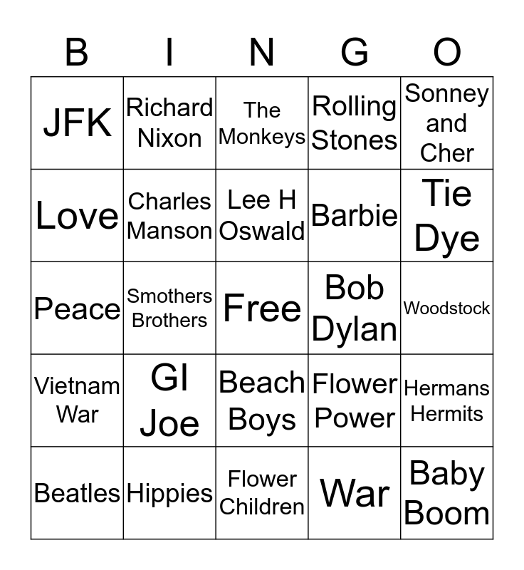 This bingo card has a free space and 24 words: GI Joe, Hippies, Lee H Oswald, Beatles, Sonney and Cher, JFK, Love, Richard Nixon, Bob Dylan, Beach Boys, Barbie, Peace, Flower Power, Hermans Hermits, Charles Manson, War, Woodstock, The Monkeys, Tie Dye, Smothers Brothers, Baby Boom, Vietnam War, Rolling Stones and Flower Children.