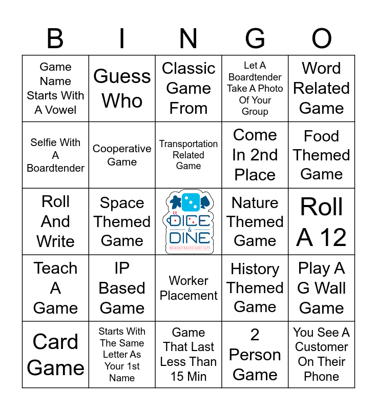 This bingo card has a free space and 34 words: Math Based Game, 2 Person Game, Game You Have Never Played, Uno, Teach A Game, Cooperative Game, Word Related Game, Card Game, Guess Who, Jenga, Transportation Related Game, Classic Game From, Game With Play Money, Animal Themed Game, Nature Themed Game, Food Themed Game, Starts With The Same Letter As Your 1st Name, Roll And Write, IP Based Game, History Themed Game, Worker Placement, Solo Game, Game Name Starts With A Vowel, Roll A 12, Game That Last Less Than 15 Min, You See A Customer On Their Phone, Let A Boardtender Take A Photo Of Your Group, Play As A RED Token, Come In 2nd Place, Selfie With A Boardtender, Roll A 2, Space Themed Game, Play A G Wall Game and Play Game From 30-34.