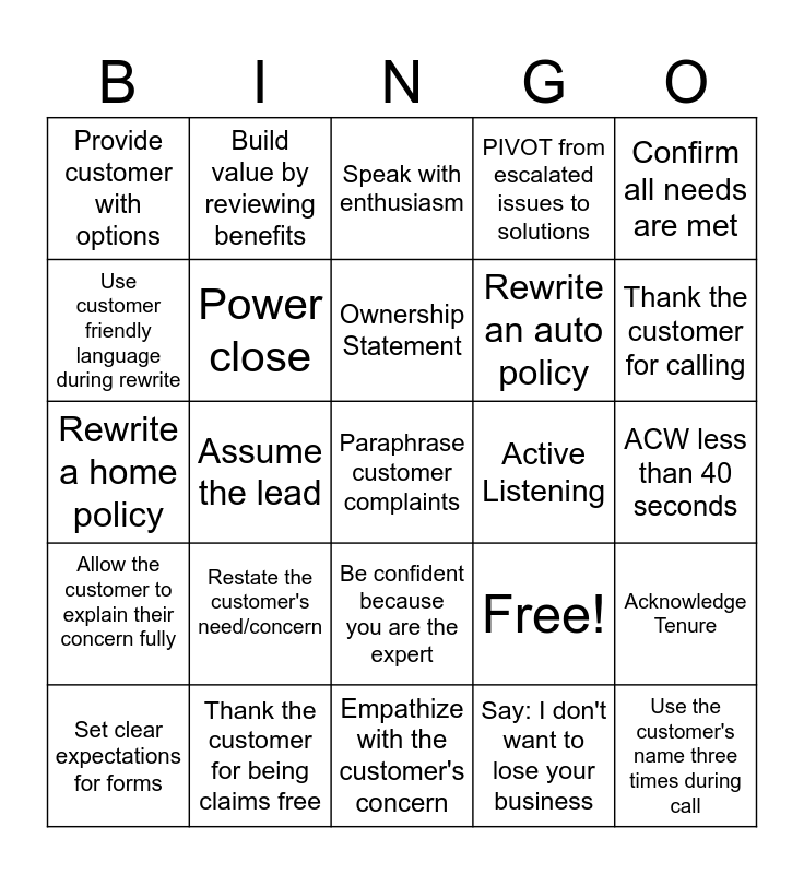 This bingo card has 25 words: Restate the customer's need/concern, Empathize with the customer's concern, Ownership Statement, Set clear expectations for forms, Confirm all needs are met, Provide customer with options, Use customer friendly language during rewrite, Build value by reviewing benefits, Active Listening, Be confident because you are the expert, Rewrite an auto policy, Rewrite a home policy, Free!, Acknowledge Tenure, Power close, Use the customer's name three times during call, ACW less than 40 seconds, Speak with enthusiasm, Thank the customer for calling, Assume the lead, Paraphrase customer complaints, Thank the customer for being claims free, Allow the customer to explain their concern fully, PIVOT from escalated issues to solutions and Say: I don't want to lose your business.