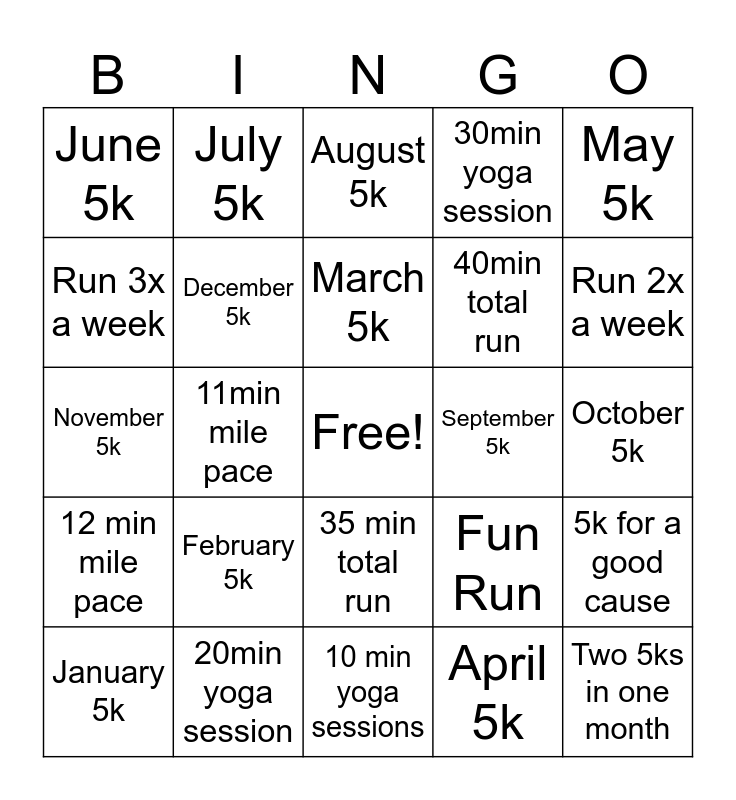 This bingo card has a free space and 24 words: January 5k, February 5k, March 5k, April 5k, May 5k, June 5k, July 5k, August 5k, September 5k, October 5k, November 5k, December 5k, Fun Run, 5k for a good cause, Run 3x a week, 20min yoga session, 10 min yoga sessions, 30min yoga session, Run 2x a week, 12 min mile pace, 11min mile pace, 35 min total run, 40min total run and Two 5ks in one month.