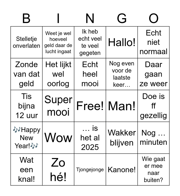 This bingo card has a free space and 24 words: Wow, Zo hé!, Echt heel mooi, Wat een knal!, Echt niet normaal, Stelletje onverlaten, Zonde van dat geld, Weet je wel hoeveel geld daar de lucht ingaat, Man!, … is het al 2025, Nog even voor de laatste keer…, Tis bijna 12 uur, Wakker blijven, Nog … minuten, Het lijkt wel oorlog, Kanone!, Doe is ff gezellig, Ik heb echt veel te veel gegeten, Daar gaan ze weer, Super mooi, Wie gaat er mee naar buiten?, 🎶Happy New Year!🎶, Hallo! and Tjongejonge.