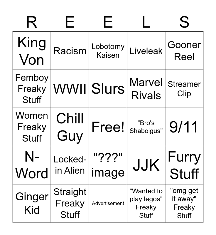 This bingo card has a free space and 24 words: Locked-in Alien, Straight Freaky Stuff, Slurs, Ginger Kid, Gooner Reel, King Von, Femboy Freaky Stuff, Racism, "Bro's Shaboigus", "???" image, Marvel Rivals, Women Freaky Stuff, JJK, Furry Stuff, WWII, "Wanted to play legos" Freaky Stuff, 9/11, Lobotomy Kaisen, Streamer Clip, Chill Guy, "omg get it away" Freaky Stuff, N-Word, Liveleak and Advertisement.