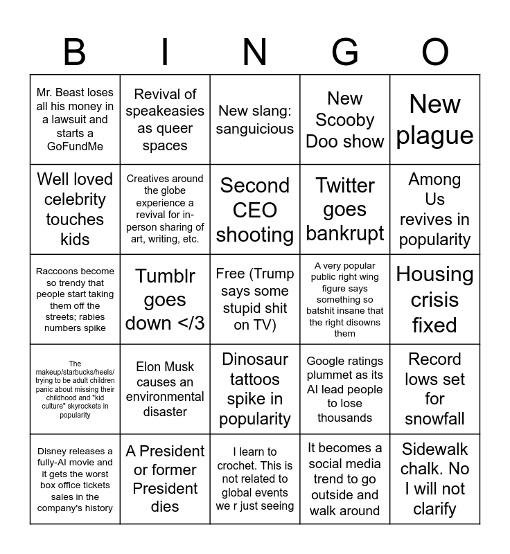 This bingo card has a free space and 24 words: Elon Musk causes an environmental disaster, A President or former President dies, Second CEO shooting, Disney releases a fully-AI movie and it gets the worst box office tickets sales in the company's history, New plague, Mr. Beast loses all his money in a lawsuit and starts a GoFundMe, Well loved celebrity touches kids, Revival of speakeasies as queer spaces, A very popular public right wing figure says something so batshit insane that the right disowns them, Dinosaur tattoos spike in popularity, Twitter goes bankrupt, Raccoons become so trendy that people start taking them off the streets; rabies numbers spike, Google ratings plummet as its AI lead people to lose thousands, Record lows set for snowfall, Creatives around the globe experience a revival for in-person sharing of art, writing, etc., It becomes a social media trend to go outside and walk around, Housing crisis fixed, New slang: sanguicious, Among Us revives in popularity, Tumblr goes down </3, Sidewalk chalk. No I will not clarify, The makeup/starbucks/heels/ trying to be adult children panic about missing their childhood and "kid culture" skyrockets in popularity, New Scooby Doo show and I learn to crochet. This is not related to global events we r just seeing.
