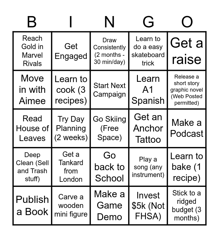 This bingo card has a free space and 24 words: Get a Tankard from London, Carve a wooden mini figure, Start Next Campaign, Publish a Book, Get a raise, Reach Gold in Marvel Rivals, Move in with Aimee, Get Engaged, Get an Anchor Tattoo, Go back to School, Learn A1 Spanish, Read House of Leaves, Play a song (any instrument), Learn to bake (1 recipe), Learn to cook (3 recipes), Invest $5k (Not FHSA), Make a Podcast, Draw Consistently (2 months - 30 min/day), Release a short story graphic novel (Web Posted permitted), Try Day Planning (2 weeks), Stick to a ridged budget (3 months), Deep Clean (Sell and Trash stuff), Learn to do a easy skateboard trick and Make a Game Demo.