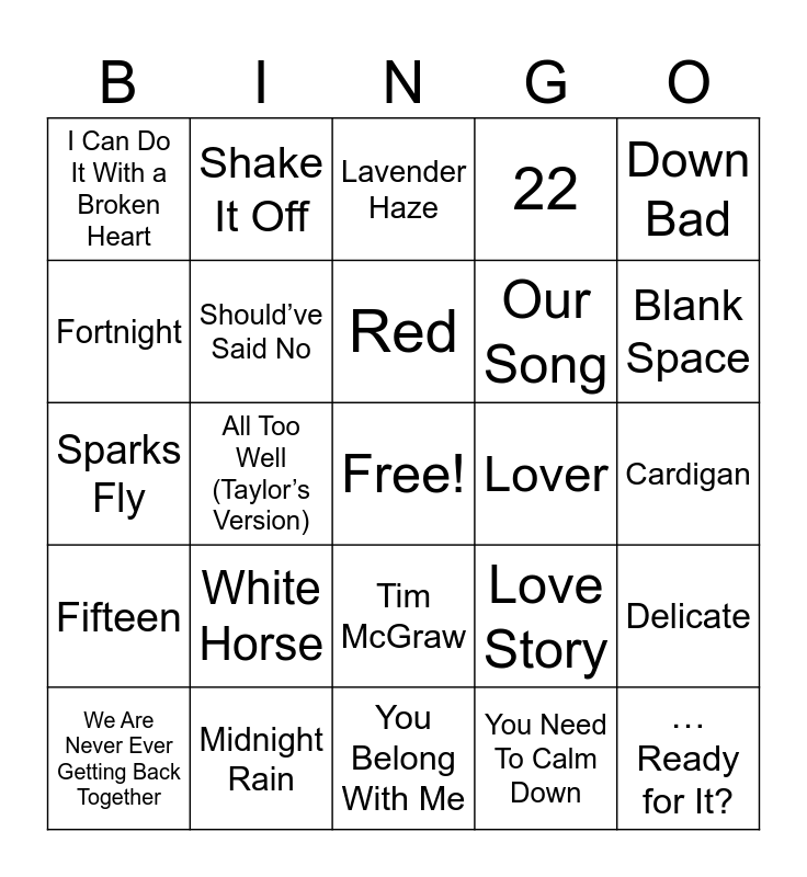 This bingo card has a free space and 40 words: Bejeweled, Sparks Fly, Picture To Burn, Should’ve Said No, Midnight Rain, Tim McGraw, Red, Mean, Down Bad, Fifteen, All Too Well (Taylor’s Version), 22, …Ready for It?, Cardigan, Lover, White Horse, Willow, I Can Do It With a Broken Heart, Back to December, Lavender Haze, Delicate, You Need To Calm Down, Our Song, Fortnight, Karma, Teardrops on My Guitar, Mine, Look What You Made Me Do, Style, Wildest Dreams, Bad Blood, We Are Never Ever Getting Back Together, I Knew You Were Trouble., Love Story, Blank Space, You Belong With Me, Anti-Hero, Cruel Summer, Shake It Off and Fearless.