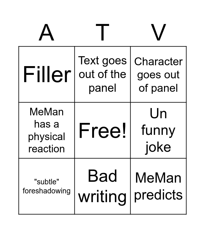 This bingo card has a free space and 11 words: Illegible handwriting, Bad writing, MeMan predicts, "subtle" foreshadowing, Text goes out of the panel, Character goes out of panel, Un funny joke, MeMan loses the plot, MeMan has a physical reaction, Filler and "I love this comic :)".