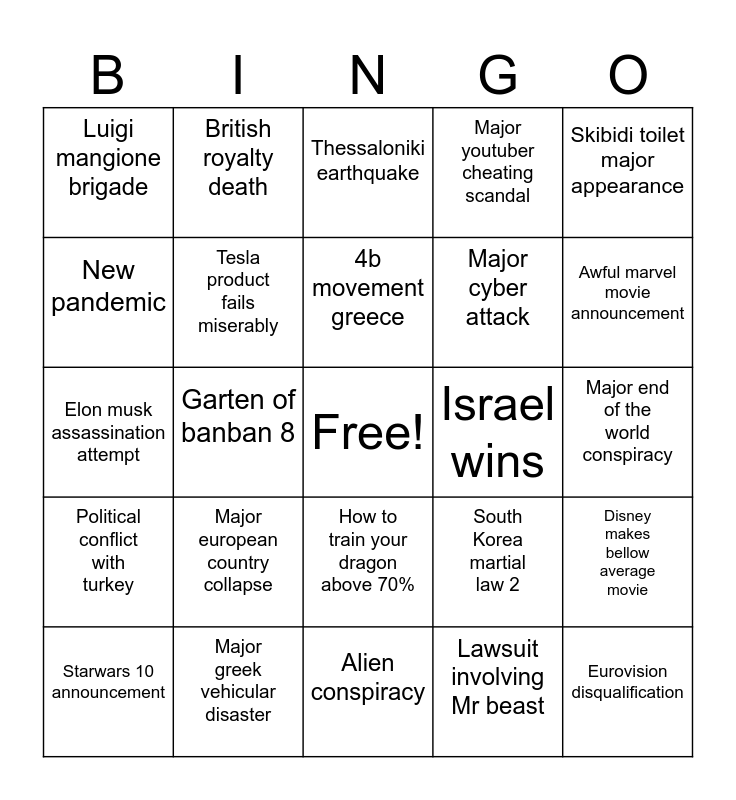 This bingo card has a free space and 24 words: Major european country collapse, Major greek vehicular disaster, 4b movement greece, Starwars 10 announcement, Skibidi toilet major appearance, Luigi mangione brigade, New pandemic, British royalty death, Israel wins, How to train your dragon above 70%, Major cyber attack, Elon musk assassination attempt, South Korea martial law 2, Disney makes bellow average movie, Tesla product fails miserably, Lawsuit involving Mr beast, Major end of the world conspiracy, Thessaloniki earthquake, Awful marvel movie announcement, Garten of banban 8, Eurovision disqualification, Political conflict with turkey, Major youtuber cheating scandal and Alien conspiracy.