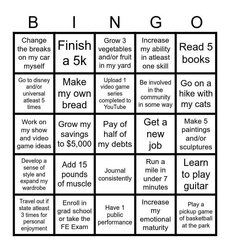 This bingo card has 25 words: Add 15 pounds of muscle, Have 1 public performance, Upload 1 video game series completed to YouTube, Travel out if state atleast 3 times for personal enjoyment, Read 5 books, Change the breaks on my car myself, Go to disney and/or universal atleast 5 times, Finish a 5k, Get a new job, Journal consistently, Be involved in the community in some way, Work on my show and video game ideas, Run a mile in under 7 minutes, Learn to play guitar, Make my own bread, Play a pickup game of basketball at the park, Make 5 paintings and/or sculptures, Grow 3 vegetables and/or fruit in my yard, Go on a hike with my cats, Grow my savings to $5,000, Pay of half of my debts, Enroll in grad school or take the FE Exam, Develop a sense of style and expand my wardrobe, Increase my ability in atleast one skill and Increase my emotional maturity.