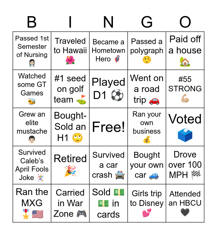 This bingo card has a free space and 25 words: Retired ๐, Sold ๐ต๐ต in cards, Played D1 โฝ๏ธ, Ran the MXG ๐๏ธ๐บ๐ธ, Paid off a house ๐ก, Passed 1st Semester of Nursing ๐ฉ๐ปโโ๏ธ, Watched some GT Games ๐, Traveled to Hawaii ๐บ, Ran your own business๐ฐ, Survived a car crash ๐, Went on a road trip ๐, Grew an elite mustache ๐จ๐ป, Bought your own car ๐, Drove over 100 MPH ๐, #1 seed on golf team โณ๏ธ, Got a 4.0 โ , Voted ๐ณ๏ธ, Became a Hometown Hero ๐ฆธ๐ป, #55 STRONG ๐ช๐ผ, Bought-Sold an H1 ๐, Attended an HBCU ๐ค, Carried in War Zone ๐ฎ, Survived Calebโs April Fools Joke ๐, Passed a polygraph ๐คฅ and Girls trip to Disney ๐.