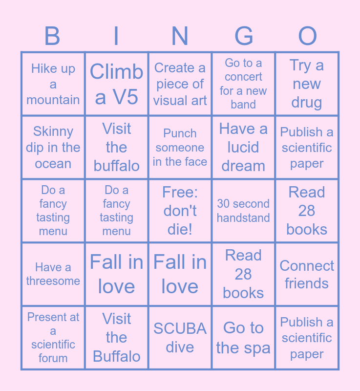 This bingo card has a free space and 48 words: Get a tattoo, Publish a scientific paper, Present at a scientific forum, SCUBA dive, Fall in love, Have a threesome, Climb a V5, Climb a 5.12, Skinny dip in the ocean, Friend vacation, Visit the buffalo, Go to a concert for a new band, Connect friends, Read 28 books, Write 28 poems, Make someone squirt, Punch someone in the face, 30 second handstand, Create a piece of visual art, Try a new drug, Do a fancy tasting menu, Go to the spa, Hike up a mountain, Have a lucid dream, Get a tattoo, Publish a scientific paper, Present at a scientific forum, SCUBA dive, Fall in love, Have a threesome, Climb a V5, Climb a 5.12, Skinny dip in the ocean, Friend vacation, Visit the Buffalo, Go to a concert for a new band, Reconnect with a friend, Read 28 books, Write 28 poems, Make someone squirt, Punch someone in the face, 30 second handstand, Create a piece of visual art, Try a new drug, Do a fancy tasting menu, Go to the spa, Hike up a mountain and Have a lucid dream.
