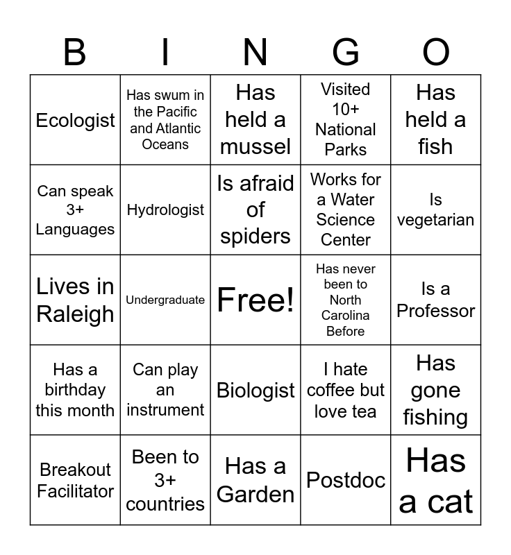 This bingo card has a free space and 29 words: Breakout Facilitator, Goes to NCSU, Undergraduate, Graduate Student, Ecologist, Has held a mussel, Hydrologist, Can play an instrument, Has never been to North Carolina Before, Been to 3+ countries, Is a Professor, Has a cat, Has a Garden, Postdoc, Is vegetarian, Lived in 2+ countries, Biologist, Has a birthday this month, Has held a fish, Lives in Raleigh, I hate coffee but love tea, Does not have any pets, Works for a Water Science Center, Can speak 3+ Languages, Visited 10+ National Parks, Has swum in the Pacific and Atlantic Oceans, Has gone fishing, Is afraid of spiders and Has held a frog.