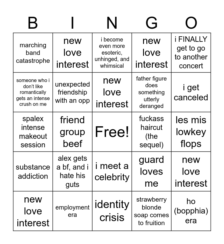 This bingo card has a free space and 29 words: new love interest, permit!!, friend group beef, vacation to europe, marching band catastrophe, i become even more esoteric, unhinged, and whimsical, unexpected friendship with an opp, alex gets a bf, and i hate his guts, fuckass haircut (the sequel), employment era, les mis lowkey flops, ho (bopphia) era, identity crisis, strawberry blonde soap comes to fruition, i get canceled, situationship pt3, i meet a celebrity, substance addiction, i FINALLY get to go to another concert, spalex intense makeout session, guard loves me, i become a niche internet microinfluencer, father figure does something utterly deranged, someone who i don’t like romantically gets an intense crush on me, new love interest, new love interest, new love interest, new love interest and new love interest.