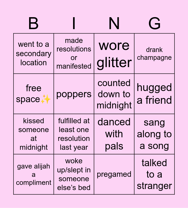 This bingo card has 16 words: woke up/slept in someone else’s bed, sang along to a song, wore glitter, went to a secondary location, kissed someone at midnight, made resolutions or manifested, danced with pals, pregamed, free space✨, poppers, gave alijah a compliment, drank champagne, fulfilled at least one resolution last year, hugged a friend, counted down to midnight and talked to a stranger.