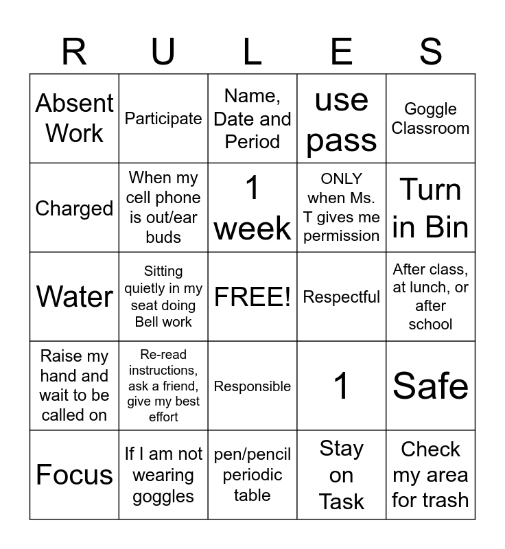This bingo card has a free space and 24 words: Re-read instructions, ask a friend, give my best effort, If I am not wearing goggles, 1 week, Focus, Goggle Classroom, Absent Work, Charged, Participate, Respectful, Responsible, ONLY when Ms. T gives me permission, Water, 1, Safe, When my cell phone is out/ear buds, Stay on Task, After class, at lunch, or after school, Name, Date and Period, Turn in Bin, Sitting quietly in my seat doing Bell work, Check my area for trash, Raise my hand and wait to be called on, use pass and pen/pencil periodic table.