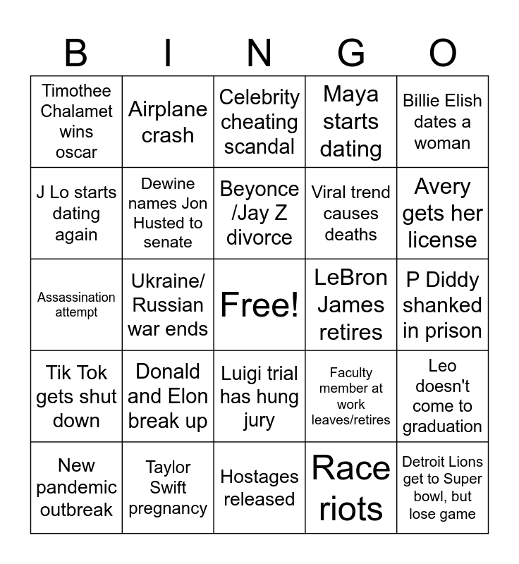 This bingo card has a free space and 24 words: Donald and Elon break up, Taylor Swift pregnancy, Beyonce /Jay Z divorce, New pandemic outbreak, Billie Elish dates a woman, Timothee Chalamet wins oscar, J Lo starts dating again, Airplane crash, LeBron James retires, Luigi trial has hung jury, Viral trend causes deaths, Assassination attempt, Faculty member at work leaves/retires, Leo doesn't come to graduation, Dewine names Jon Husted to senate, Race riots, P Diddy shanked in prison, Celebrity cheating scandal, Avery gets her license, Ukraine/ Russian war ends, Detroit Lions get to Super bowl, but lose game, Tik Tok gets shut down, Maya starts dating and Hostages released.