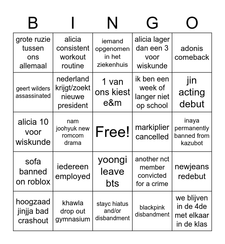 This bingo card has a free space and 24 words: iedereen employed, khawla drop out gymnasium, 1 van ons kiest e&m, hoogzaad jinjja bad crashout, adonis comeback, grote ruzie tussen ons allemaal, geert wilders assassinated, alicia consistent workout routine, markiplier cancelled, yoongi leave bts, ik ben een week of langer niet op school, alicia 10 voor wiskunde, another nct member convicted for a crime, newjeans redebut, nederland krijgt/zoekt nieuwe president, blackpink disbandment, inaya permanently banned from kazubot, iemand opgenomen in het ziekenhuis, jin acting debut, nam joohyuk new romcom drama, we blijven in de 4de met elkaar in de klas, sofa banned on roblox, alicia lager dan een 3 voor wiskunde and stayc hiatus and/or disbandment.