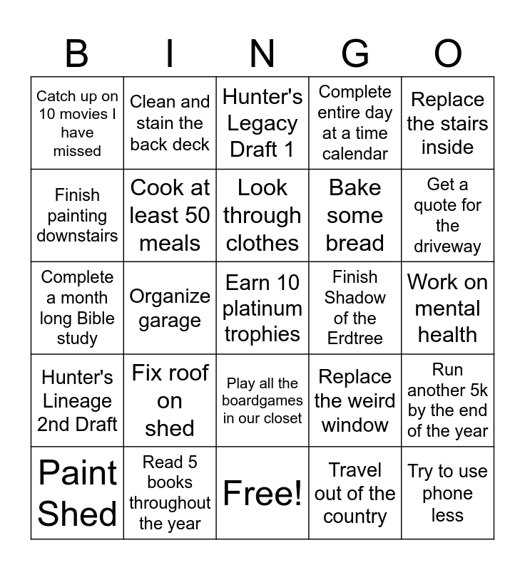 This bingo card has 25 words: Hunter's Lineage 2nd Draft, Read 5 books throughout the year, Earn 10 platinum trophies, Travel out of the country, Replace the stairs inside, Catch up on 10 movies I have missed, Clean and stain the back deck, Hunter's Legacy Draft 1, Finish Shadow of the Erdtree, Run another 5k by the end of the year, Finish painting downstairs, Cook at least 50 meals, Free!, Replace the weird window, Get a quote for the driveway, Paint Shed, Organize garage, Look through clothes, Bake some bread, Work on mental health, Complete a month long Bible study, Fix roof on shed, Play all the boardgames in our closet, Complete entire day at a time calendar and Try to use phone less.