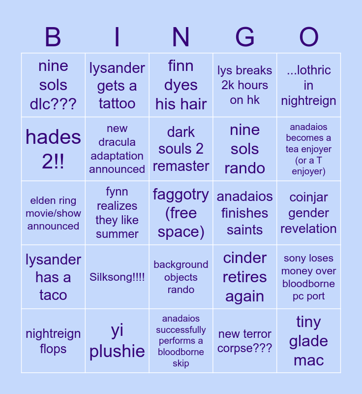 This bingo card has a free space and 24 words: Silksong!!!!, yi plushie, dark souls 2 remaster, nightreign flops, ...lothric in nightreign, nine sols dlc???, hades 2!!, lysander gets a tattoo, anadaios finishes saints, background objects rando, nine sols rando, elden ring movie/show announced, cinder retires again, sony loses money over bloodborne pc port, new dracula adaptation announced, new terror corpse???, coinjar gender revelation, finn dyes his hair, anadaios becomes a tea enjoyer (or a T enjoyer), fynn realizes they like summer, tiny glade mac, lysander has a taco, lys breaks 2k hours on hk and anadaios successfully performs a bloodborne skip.