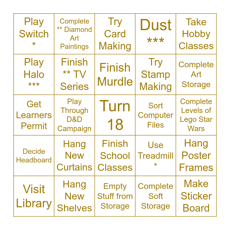 This bingo card has a free space and 24 words: Visit Library, Hang New Curtains, Finish Murdle, Complete Soft Storage, Take Hobby Classes, Play Switch *, Complete ** Diamond Art Paintings, Try Card Making, Sort Computer Files, Complete Levels of Lego Star Wars, Get Learners Permit, Finish ** TV Series, Use Treadmill *, Hang Poster Frames, Play Halo ***, Hang New Shelves, Empty Stuff from Storage, Dust ***, Complete Art Storage, Decide Headboard, Play Through D&D Campaign, Finish School Classes, Try Stamp Making and Make Sticker Board.