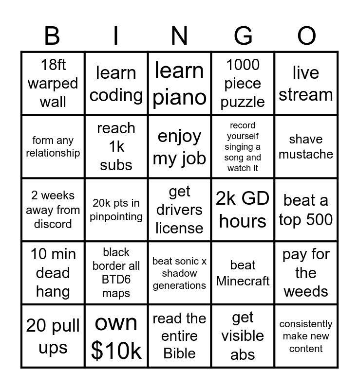 This bingo card has a free space and 24 words: black border all BTD6 maps, own $10k, enjoy my job, 20 pull ups, live stream, 18ft warped wall, form any relationship, learn coding, 2k GD hours, beat sonic x shadow generations, record yourself singing a song and watch it, 2 weeks away from discord, beat Minecraft, pay for the weeds, reach 1k subs, get visible abs, beat a top 500, learn piano, shave mustache, 20k pts in pinpointing, consistently make new content, 10 min dead hang, 1000 piece puzzle and read the entire Bible.