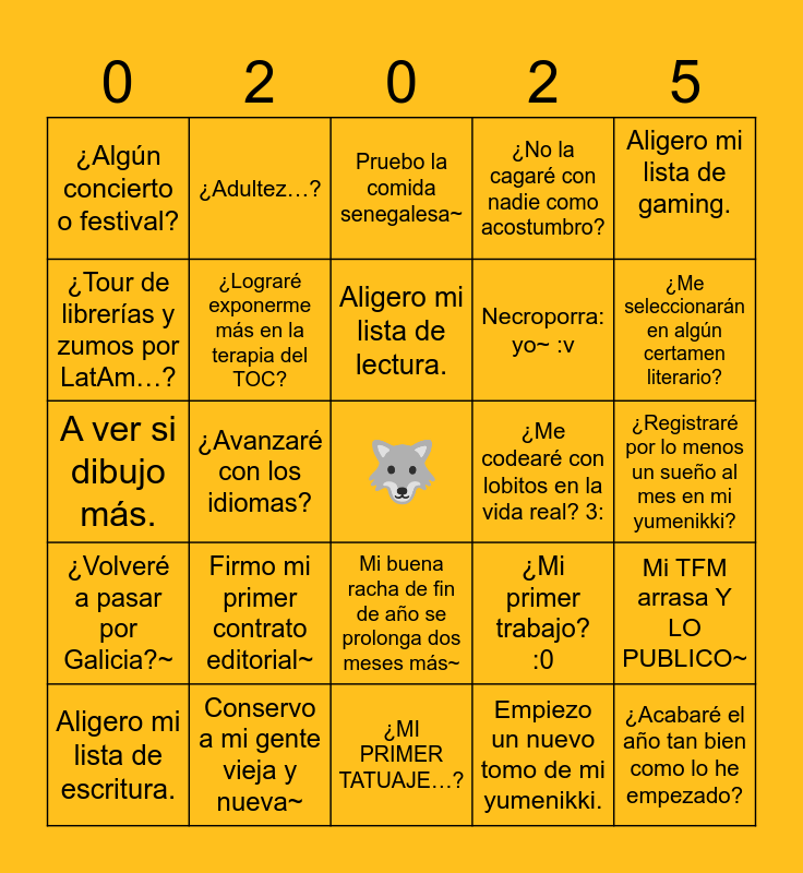 This bingo card has a free space and 24 words: Firmo mi primer contrato editorial~, Conservo a mi gente vieja y nueva~, Aligero mi lista de lectura., Aligero mi lista de escritura., Aligero mi lista de gaming., ¿Algún concierto o festival?, ¿Tour de librerías y zumos por LatAm…?, ¿Adultez…?, ¿Me codearé con lobitos en la vida real? 3:, Mi buena racha de fin de año se prolonga dos meses más~, Necroporra: yo~ :v, A ver si dibujo más., ¿Mi primer trabajo? :0, Mi TFM arrasa Y LO PUBLICO~, ¿Lograré exponerme más en la terapia del TOC?, Empiezo un nuevo tomo de mi yumenikki., ¿Registraré por lo menos un sueño al mes en mi yumenikki?, Pruebo la comida senegalesa~, ¿Me seleccionarán en algún certamen literario?, ¿Avanzaré con los idiomas?, ¿Acabaré el año tan bien como lo he empezado?, ¿Volveré a pasar por Galicia?~, ¿No la cagaré con nadie como acostumbro? and ¿MI PRIMER TATUAJE…?.