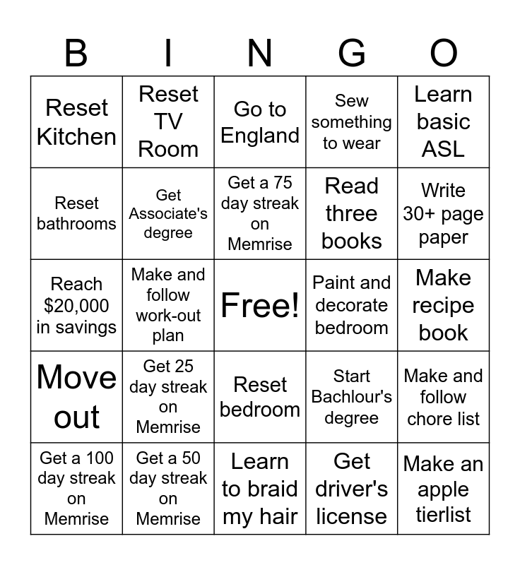 This bingo card has a free space and 24 words: Get 25 day streak on Memrise, Get a 50 day streak on Memrise, Get a 75 day streak on Memrise, Get a 100 day streak on Memrise, Learn basic ASL, Reset Kitchen, Reset bathrooms, Reset TV Room, Paint and decorate bedroom, Reset bedroom, Read three books, Reach $20,000 in savings, Start Bachlour's degree, Make and follow chore list, Get Associate's degree, Get driver's license, Make recipe book, Go to England, Write 30+ page paper, Make and follow work-out plan, Make an apple tierlist, Move out, Sew something to wear and Learn to braid my hair.
