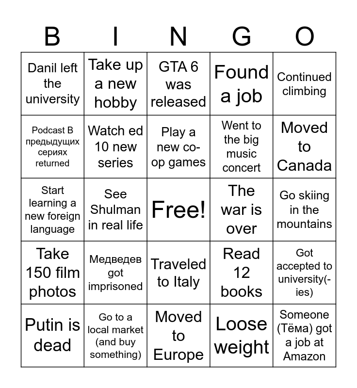 This bingo card has a free space and 24 words: Медведев got imprisoned, Go to a local market (and buy something), Play a new co-op games, Putin is dead, Continued climbing, Danil left the university, Podcast В предыдущих сериях returned, Take up a new hobby, The war is over, Traveled to Italy, Went to the big music concert, Start learning a new foreign language, Read 12 books, Got accepted to university(-ies), Watch ed 10 new series, Loose weight, Go skiing in the mountains, GTA 6 was released, Moved to Canada, See Shulman in real life, Someone (Тёма) got a job at Amazon, Take 150 film photos, Found a job and Moved to Europe.