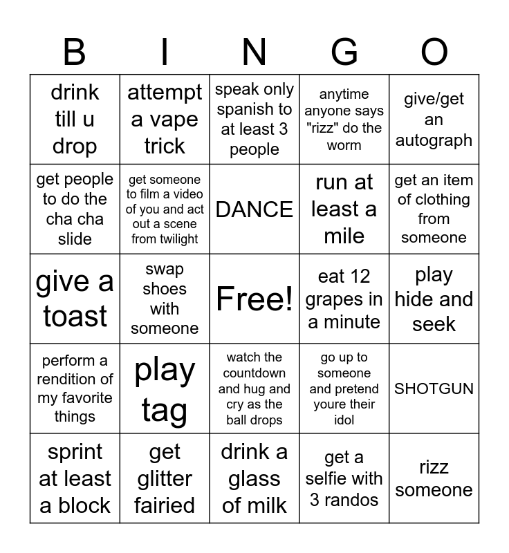 This bingo card has a free space and 24 words: play tag, get glitter fairied, DANCE, sprint at least a block, give/get an autograph, drink till u drop, get people to do the cha cha slide, attempt a vape trick, eat 12 grapes in a minute, watch the countdown and hug and cry as the ball drops, run at least a mile, give a toast, go up to someone and pretend youre their idol, SHOTGUN, get someone to film a video of you and act out a scene from twilight, get a selfie with 3 randos, play hide and seek, speak only spanish to at least 3 people, get an item of clothing from someone, swap shoes with someone, rizz someone, perform a rendition of my favorite things, anytime anyone says "rizz" do the worm and drink a glass of milk.