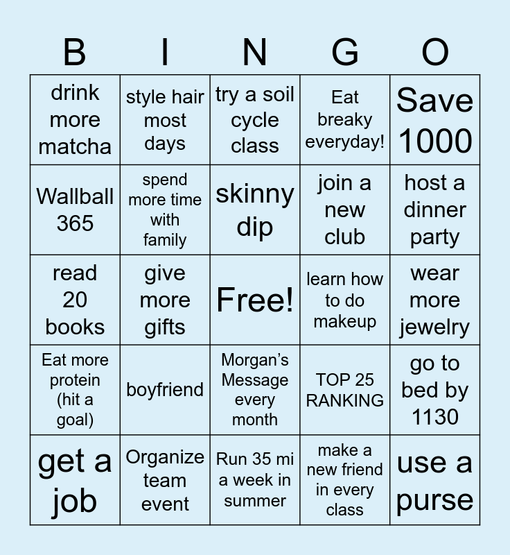 This bingo card has a free space and 25 words: boyfriend, Run 35 mi a week in summer, skinny dip, get a job, Save 1000, drink more matcha, Wallball 365, style hair most days, learn how to do makeup, Morgan’s Message every month, join a new club, read 20 books, TOP 25 RANKING, go to bed by 1130, spend more time with family, try Pilates, wear more jewelry, try a soil cycle class, host a dinner party, give more gifts, use a purse, Organize team event, Eat more protein (hit a goal), Eat breaky everyday! and make a new friend in every class.
